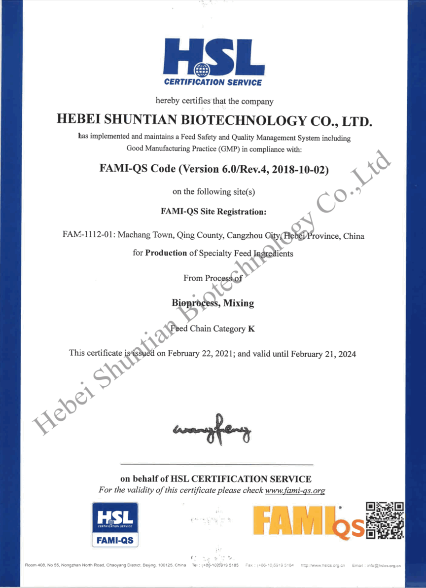 Tianjin Anqirui Technology Co.,Ltd . Это высокотехнологичное предприятие, специализирующееся на исследованиях и разработках, производстве, продажах и техническом обслуживании кормовых добавок. Оно является вице-председателем Ассоциации кормовой промышленности Цанчжоу и входит в число ведущих предприятий провинции Хэбэй. Компания расположена в городе Цанчжоу, провинция Хэбэй, что обеспечивает удобное транспортное сообщение с Пекином и портом Тяньцзинь. Она располагает передовым производственным оборудованием, цехом микробной ферментации, стандартной экспериментальной базой, командой квалифицированных научных исследователей и системой управления качеством, что гарантирует производство высокотехнологичной продукции.